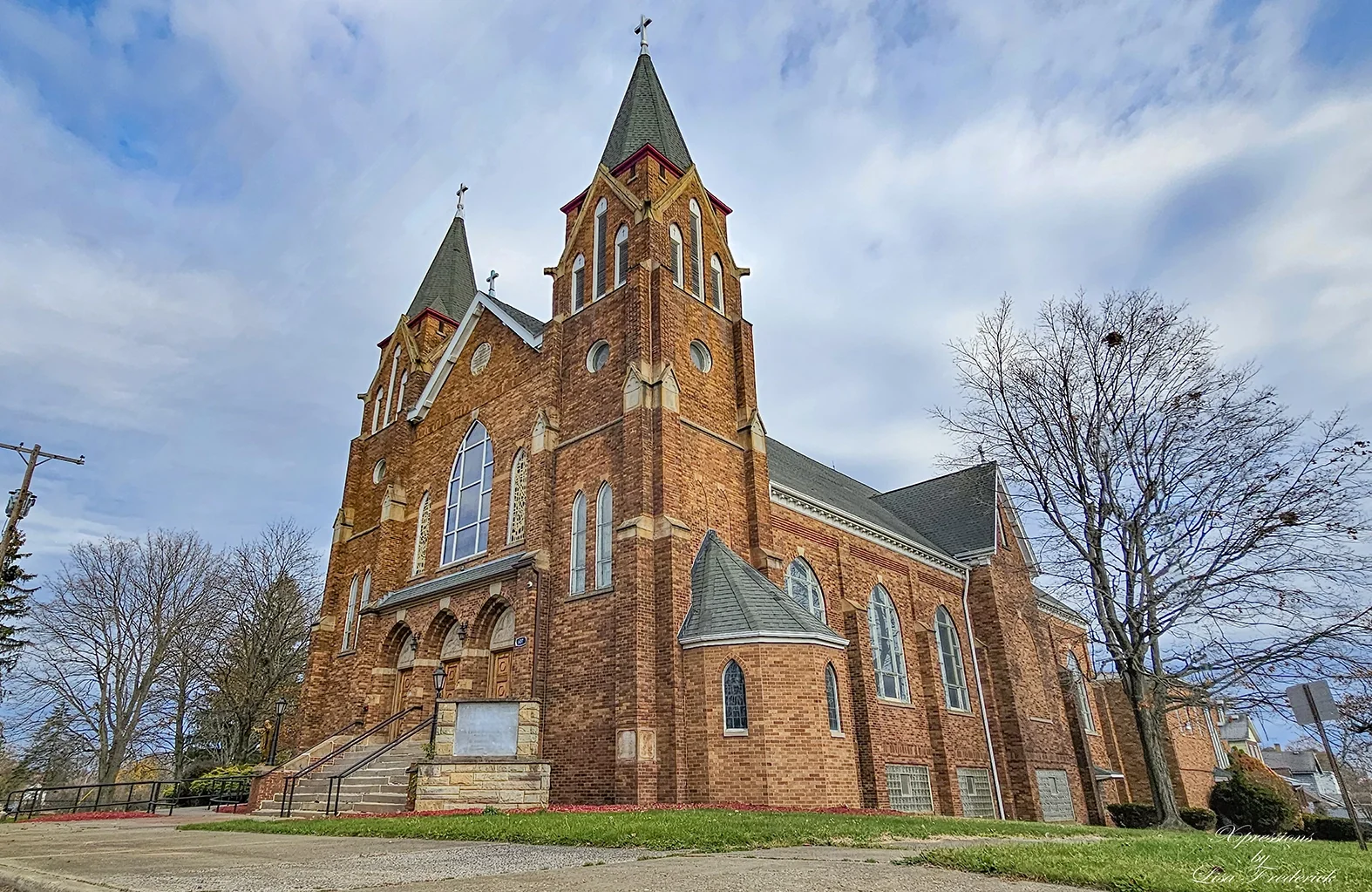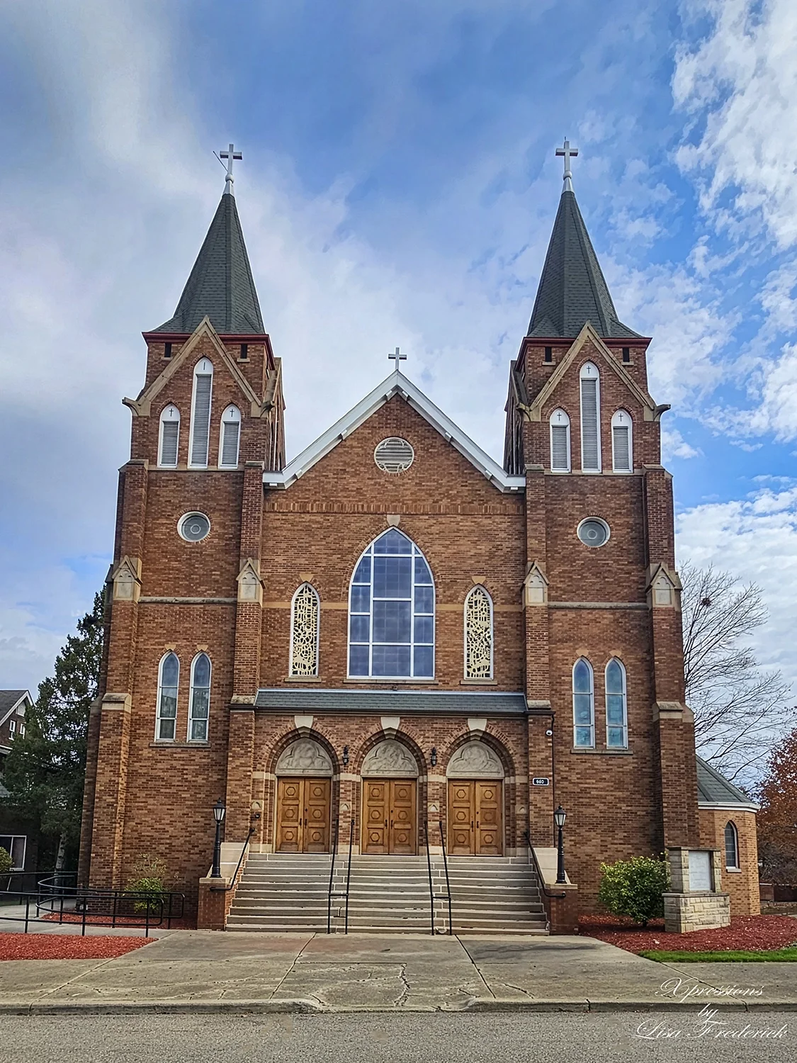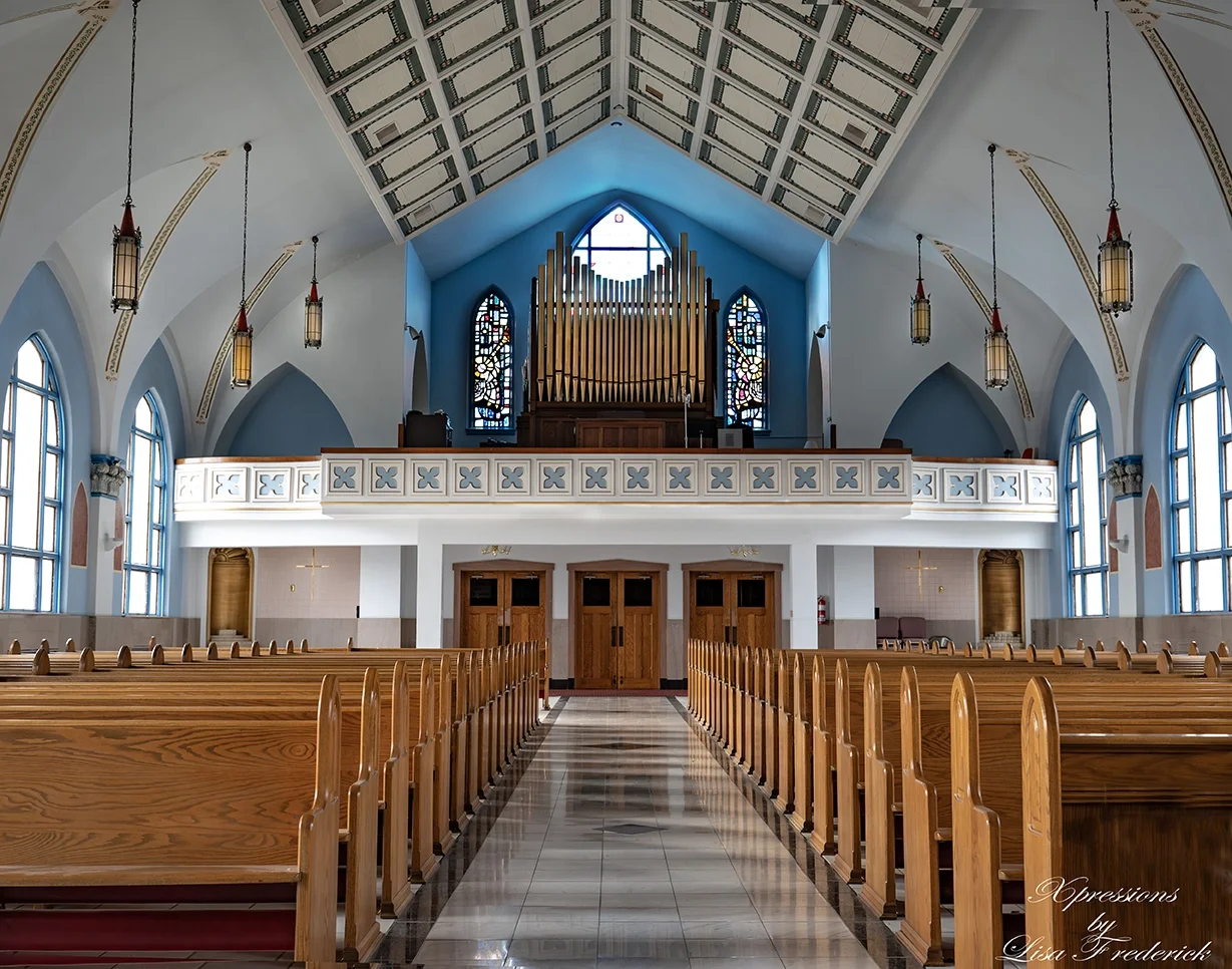 Constructed in a blend of Modernized Romanesque and refined Gothic elements, the church features rounded arches, a brick exterior with limestone accents, and thoughtful Gothic-style modifications, creating a unique, integrated design.